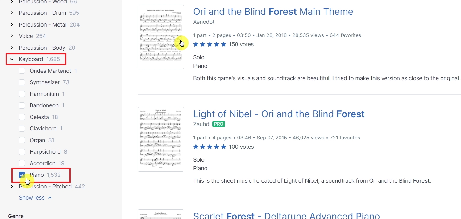 ▼마지막으로 사이트에서 피아노 전용 무료 악보를 찾는다면 Keyboard에 있는 피아노를 선택하면 됩니다. "forest"가 제목에 있는 악보 중 피아노로 칠 수 있는 것이 1,532개나 됨을 알 수 있습니다. 그럼 검색 결과에서 곡 하나를 선택해 보겠습니다.