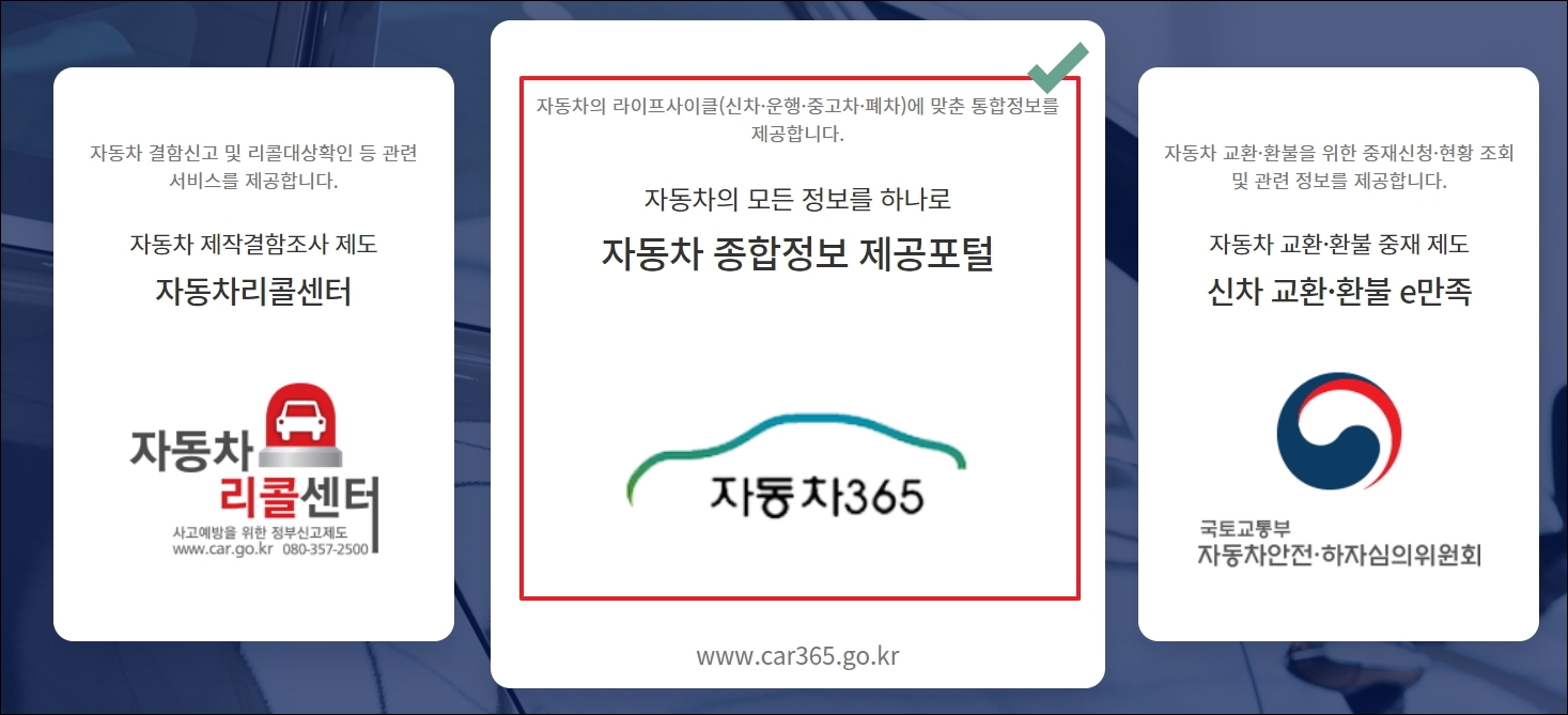 ▼자동차365 사이트에 접속했습니다. 일단 사이트 접속을 진행하면서 3가지 메뉴 중 하나를 선택해야 합니다. 차량번호 조회를 하려고 한다면 중앙에 있는 자동차 종합정보 제공포털을 선택하면 됩니다.