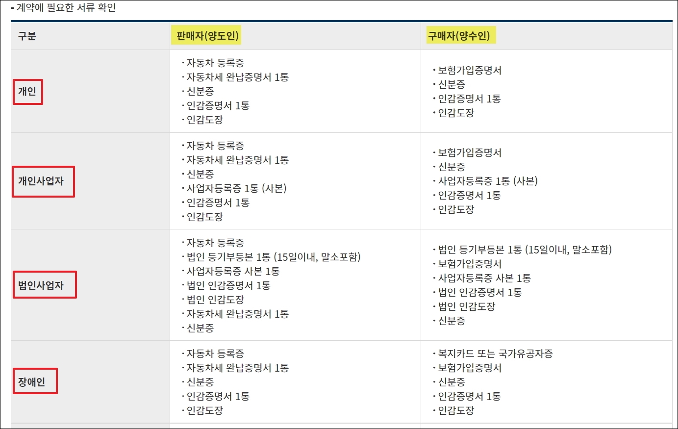 ▼마지막으로 중고차 매매 계약을 할 때 필요한 서류는 다음과 같습니다. 많은 분들이 궁금해 하는 것이고, 헷갈려 하는 부분이기 때문에 참고로 알려드립니다.