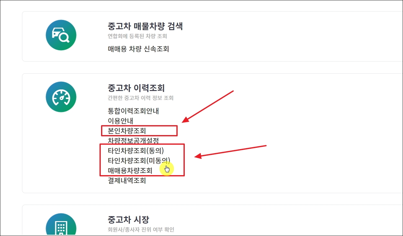 ▼중고차 매매 페이지를 열어보면 아시겠지만, 꽤 많은 하위 메뉴가 나타납니다. 여기에서 중고차 이력조회 카테고리를 살펴보아 주시길 바랍니다. 본인차량이나 타인차량에 대해 알아볼 수 있는 메뉴를 찾을 수 있습니다. 타인 소유의 자동차에 대한 정보를 열람하는 경우에는 상대방이 동의를 했을 때와 동의를 하지 않았을 때로 구분이 됩니다.