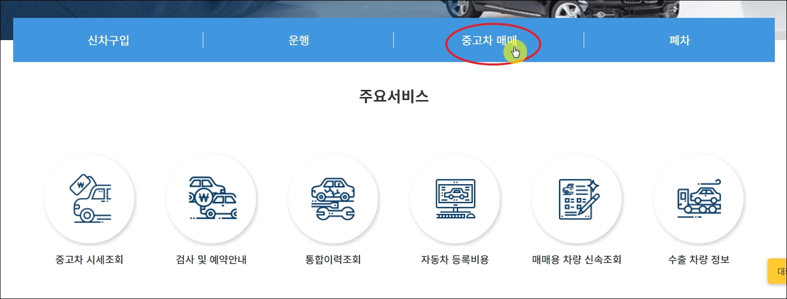 ▼홈페이지 메인화면을 보면 여러 가지 메뉴가 나타납니다. 신차 구입, 운행, 중고차 매매, 폐차 이렇게 4가지가 있죠. 그 아래에는 주요 서비스로 중고차 시세조회, 검사 및 예약안내 등 여러 가지 정보 서비스가 있습니다. 여기서 자동차 번호를 가지고 여러 정보를 열람하려면 [중고차 매매]를 선택하면 됩니다.