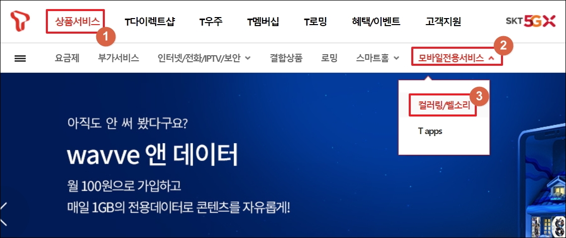 ▼티월드의 경우 로그인을 하지 않아도 누구나 이곳에서 제공하는 인기 벨소리 순위 정보에 접근할 수 있습니다. 해당 정보를 확인하기 위해서는 메뉴에 있는 [상품 서비스]를 선택합니다. 그 다음 나오는 여러 하위 메뉴 중에서 [모바일 전용 서비스]를 선택하면 벨소리 관련 메뉴를 찾을 수 있습니다.