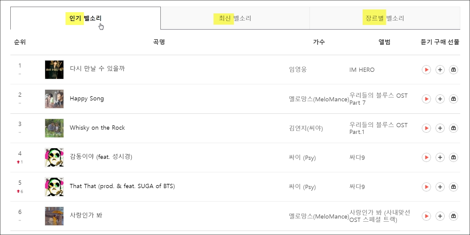 ▼저는 신뢰할 수 있는 자료를 기반으로 벨소리 순위를 알아보기 위해 통신사 사이트를 이용합니다. 통신사에서는 사람들의 음원 구매 횟수나 조회수 등의 자료를 집계할 수 있습니다. 그렇기 때문에 이곳에서 운영하는 사이트에 나온 결과가 대체로 믿을만하다고 판단됩니다. 음원을 들어볼 수 있다는 장점도 있죠.