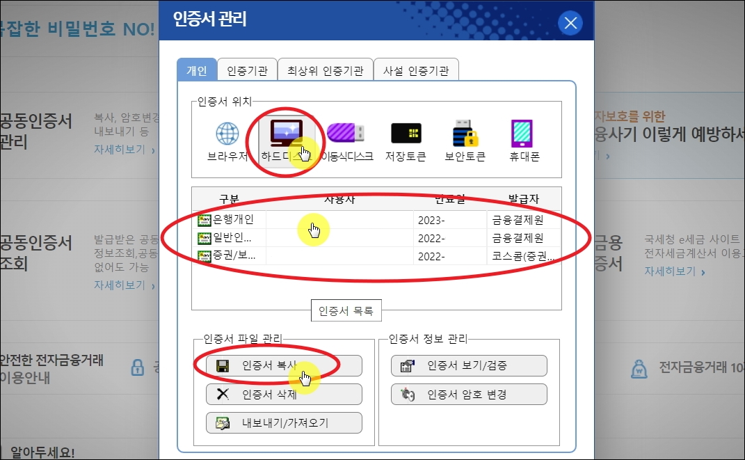 ▼인증서 관리 창이 열리면 복사할 공인인증서를 선택한 후 인증서 파일 관리 카테고리에 있는 [인증서 복사] 버튼을 누릅니다.