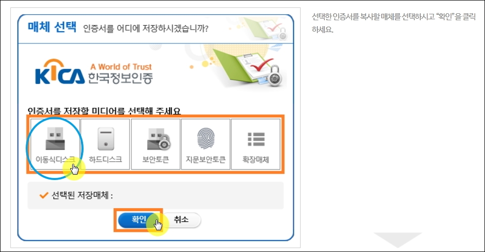 ▼암호 입력 후 [확인] 버튼을 누르면 공인인증서를 옮길 위치 또는 저장매체를 선택하는 창이 나타납니다. 여기에서 usb로 옮기는 경우에는 [이동식디스크]를 선택하면 됩니다. 이 외에도 하드디스크, 보안토큰, 지문보안토큰, 확장매체로 인증서 파일을 옮기는 것이 가능합니다.