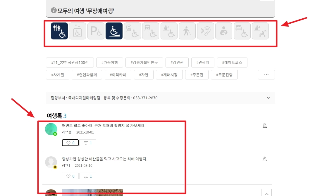 ▼픽토그램과 같은 이미지 아이콘을 통해 장애가 있으신 분들을 위한 정보도 제공하고, 이곳을 여행했던 사람들의 후기 글도 읽어볼 수 있습니다.
