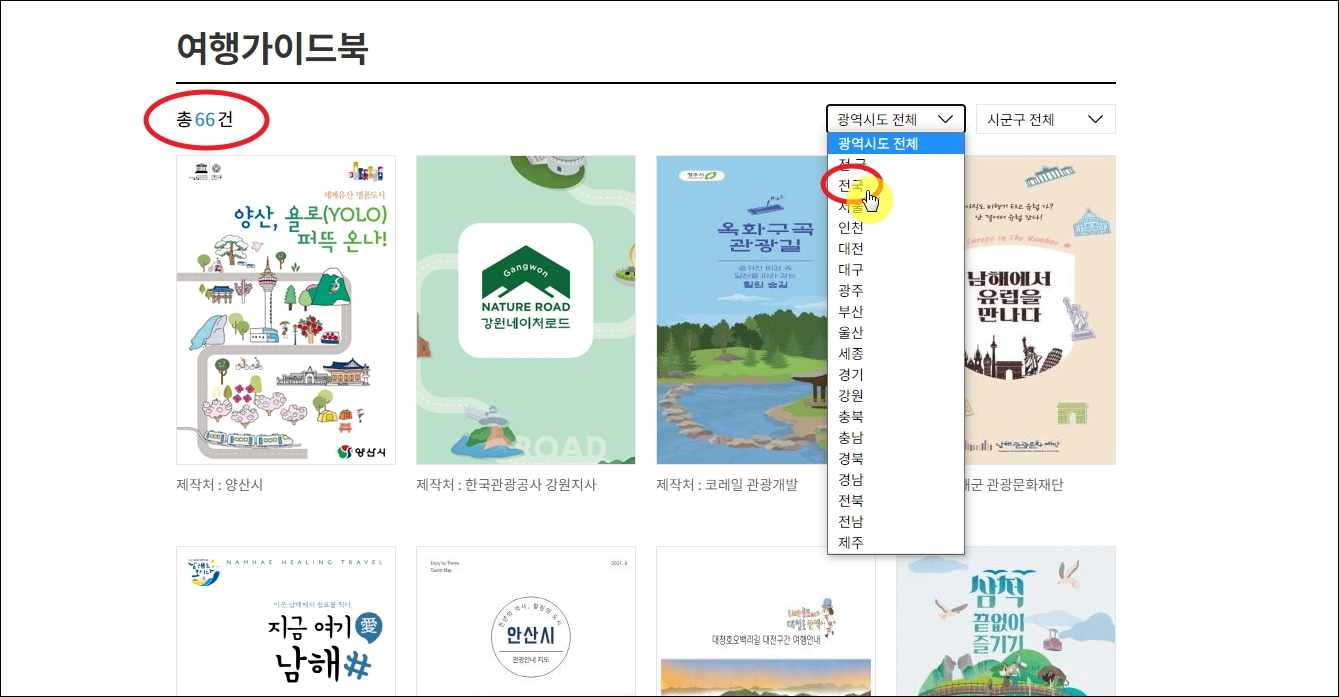 ▼메뉴를 클릭하면 총 66건의 여행 가이드북 자료를 이용할 수 있는 페이지가 열립니다. 여기에서 우측 상단에 있는 지역 선택 박스를 눌러 [전국]을 선택합니다.