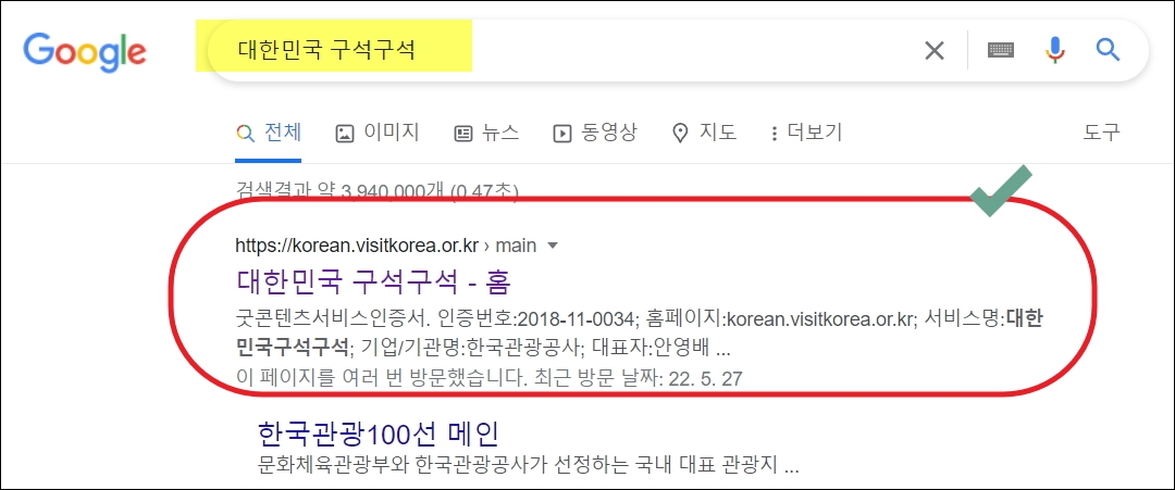 ▼기억한 관광 명소 이름을 대한민국 구석구석 홈페이지에서 검색해 봅니다. 사이트 상단에 보면 검색을 할 수 있는 창이 있습니다. 검색 결과로는 여행정보와 관련 기사, 축제, 이벤트가 나타납니다. 결과 리스트에서 자세히 알아보고 싶은 것을 마우스로 클릭해 보겠습니다.