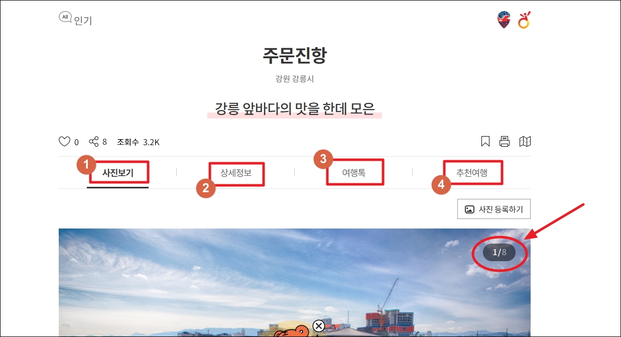 ▼저는 강릉에 있는 주문진항을 선택했습니다. 새롭게 열린 페이지에서는 해당 관광지에 대한 사진보기, 상세정보, 후기, 추천 관광지 정보를 얻을 수 있습니다.