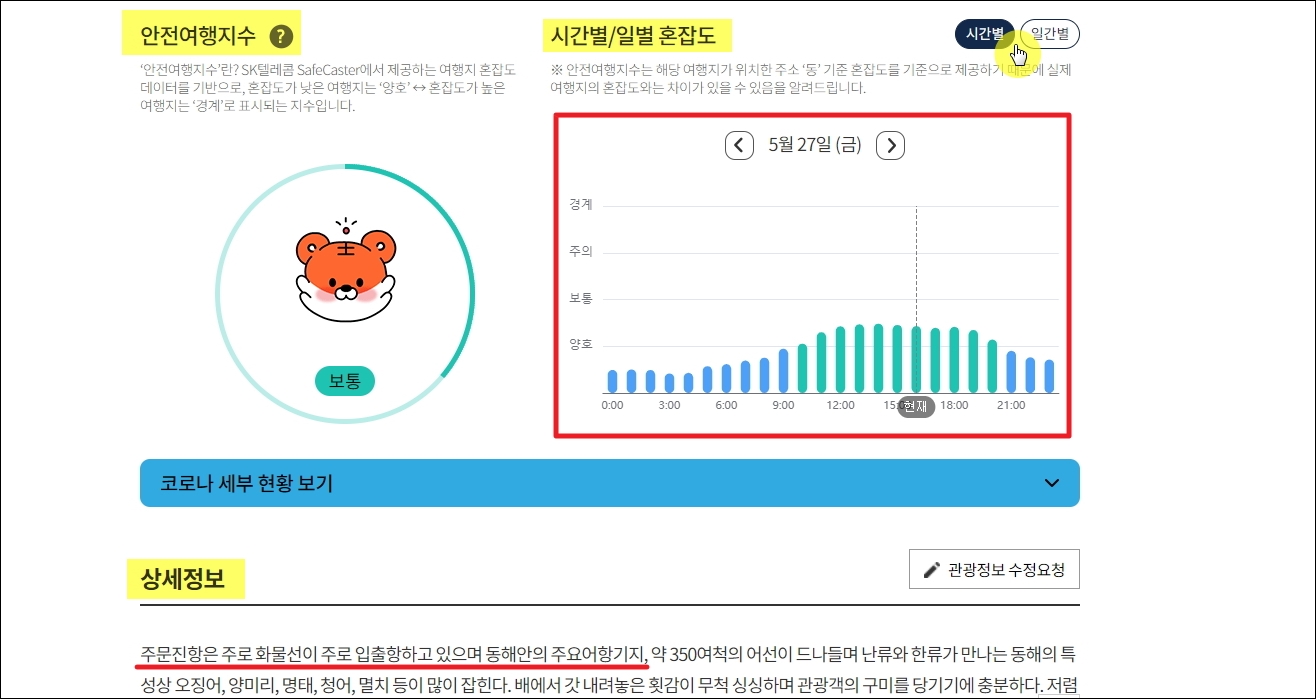▼멋진 사진과 함께 안전한 여행을 위한 안전여행지수와 관광객으로 붐비는 시간대나 요일을 피하는 데에 도움이 되는 시간별 및 일별 혼잡도 자료를 확인할 수 있습니다.