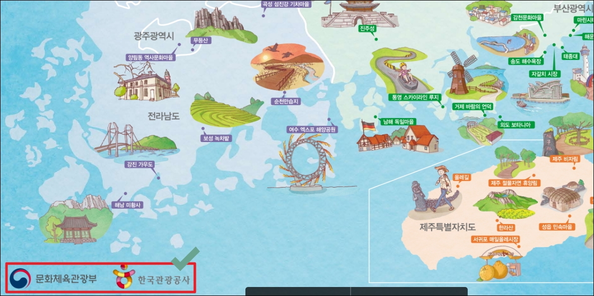▼이번에 이용할 지도 파일은 문화체육관광부와 한국관광공사에서 제작 및 배포를 하는 것입니다. 그만큼 신뢰할 수 있는 자료인 셈이죠. 그림과 관광지 이름을 통해 어느 곳에 어떠한 곳이 있는지 쉽게 파악할 수 있습니다. 이것과 함께 관광 정보 사이트를 이용하면 정확한 위치, 많은 사진, 여행에 도움이 되는 상세 정보 등을 얻을 수 있습니다.
