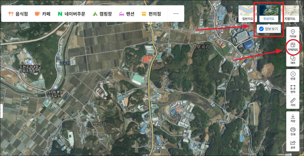 ▼첫 번째로 이용해 볼 위성지도는 네이버에서 제공하는 서비스입니다. 항상 최신 버전으로 업데이트가 되는 곳이기 때문에 다용도로 보기 좋습니다.