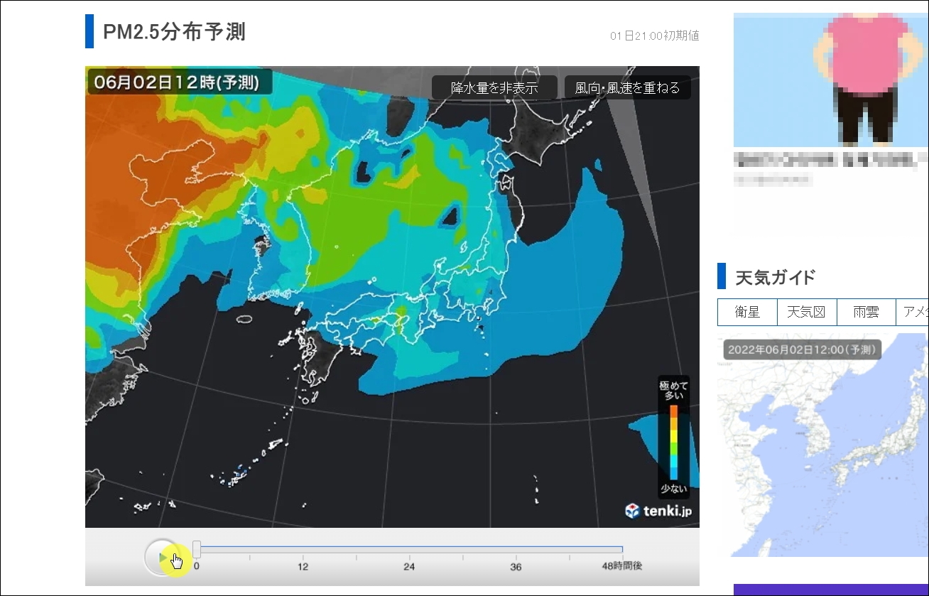 ▼먼저 PM2.5 분포를 나타내는 위성지도가 나타났습니다. 지도에서 좌측 하단에 보면 [재생] 버튼이 있습니다. 해당 버튼을 누르면 실시간 영상처럼 PM2.5의 움직임을 보는 것이 가능합니다.
