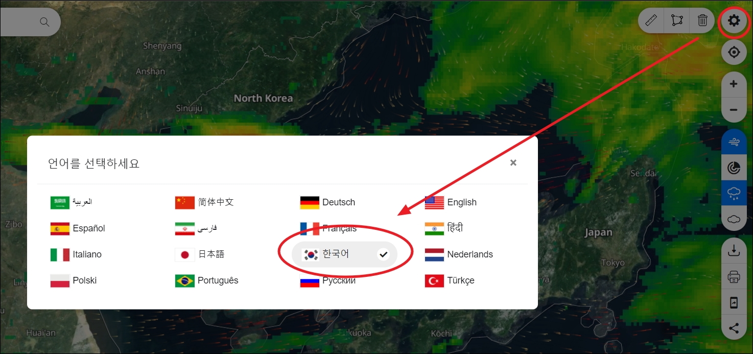 ▼화면에서 우측 상단에 보면 [톱니바퀴] 모양의 버튼이 있습니다. 해당 버튼을 누르면 언어를 한국어로 변경하는 것이 가능하오니 참고하시길 바랍니다.