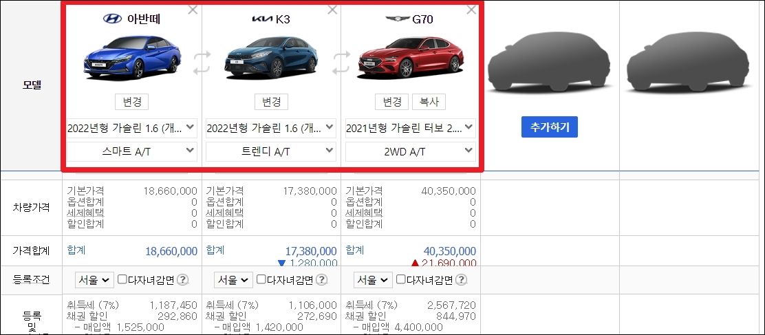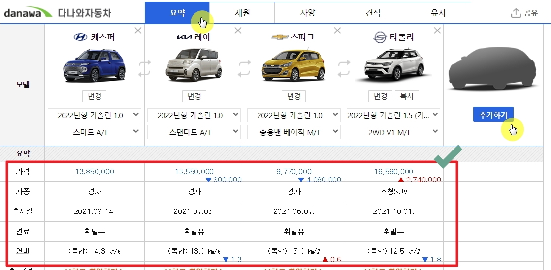 ▼간단하게 국내 차량 브랜드의 모델 몇 가지를 선택했습니다. 바로 요약 내용이 나타납니다. 가격비교는 물론이고, 차종, 출시일, 연료, 연비 등의 정보를 비교해 볼 수 있습니다. 여기서 나온 금액은 기본 가격을 의미하기 때문에 사용하길 원하는 옵션이나 판매조건 등을 선택해야 실제 구매 시 납부해야 할 최종 판매 금액이 반영됩니다.