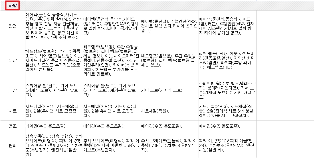 ▼다나와 자동차 사이트에서 사양 비교도 가능합니다. 안전, 외장, 내장, 시트, 공조, 편의 등 여러 부문에 있어서 확인이 가능합니다.