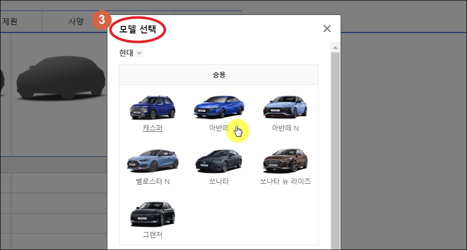 ▼브랜드 선택을 했다면 이번에는 모델을 선택할 차례입니다. 저는 현대를 선택했는데요. 해당 사이트에서는 캐스퍼, 아반떼, 쏘나타 등 현대에서 생산하는 모든 모델을 선택할 수 있습니다.