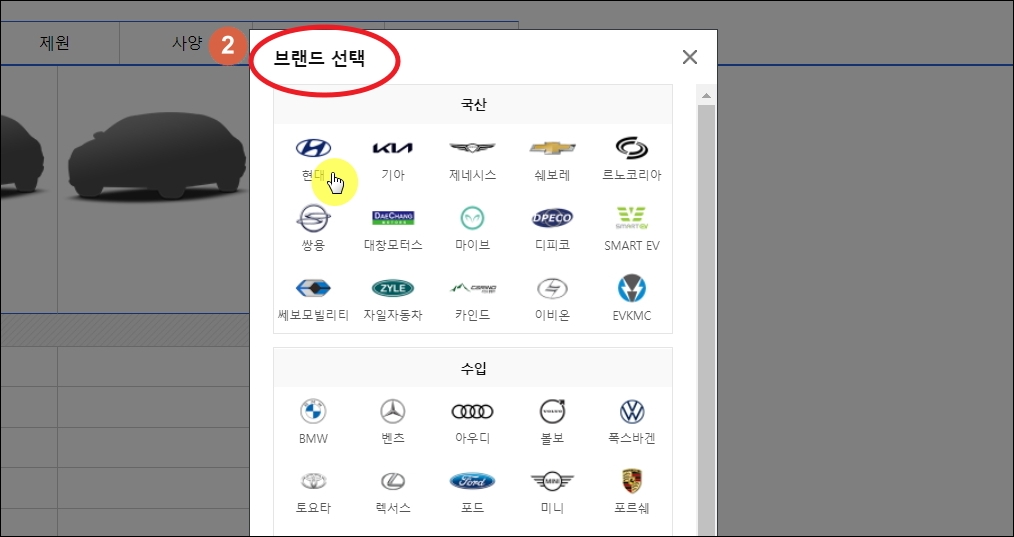 ▼추가할 자동차 모델의 브랜드를 선택합니다. 현대, 기아, 제네시스, 쉐보레 등 국산차 브랜드는 물론이고, 수입차에 해당하는 BMW, 벤츠, 볼보, 아우디, 폭스바겐 등을 선택하는 것도 가능합니다.