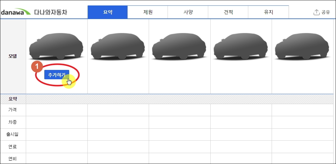 ▼다나와 자동차 사이트의 모델비교 페이지가 열렸습니다. 여기서 가장 먼저 해야 할 일은 관심 있는 모델을 추가하는 것입니다. 총 5개를 추가할 수 있고, [추가하기] 버튼을 누르면 됩니다.
