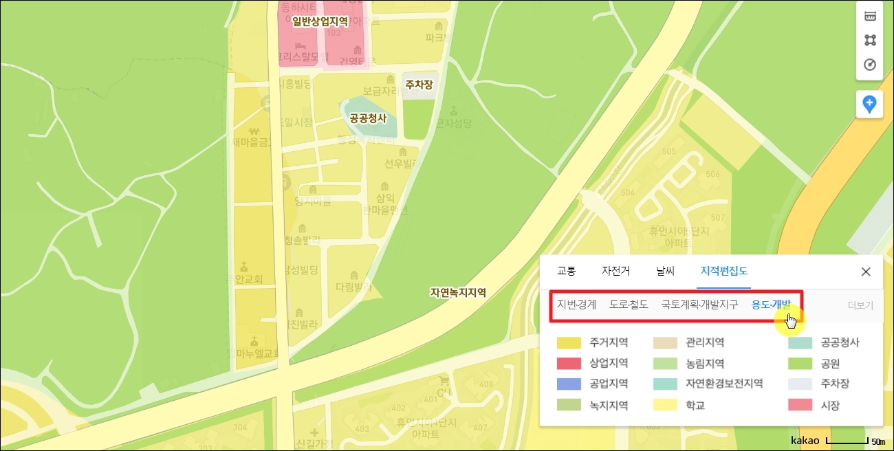 ▼지적도가 나왔습니다. 우측 하단에 보면 지적편집도 관련 메뉴와 범례가 나타나는데, 여기에서 지번, 경계, 도로, 철도, 국토계획, 개발지구, 용도, 개발 등의 세부 메뉴를 선택할 수 있게 되어 있습니다. 용도 및 개발을 클릭해 보면 지적도 상에 주거지역, 상업지역, 공업지역, 녹지지역, 관리지역 등을 쉽게 구분할 수 있도록 하이라이트 표시가 됩니다.