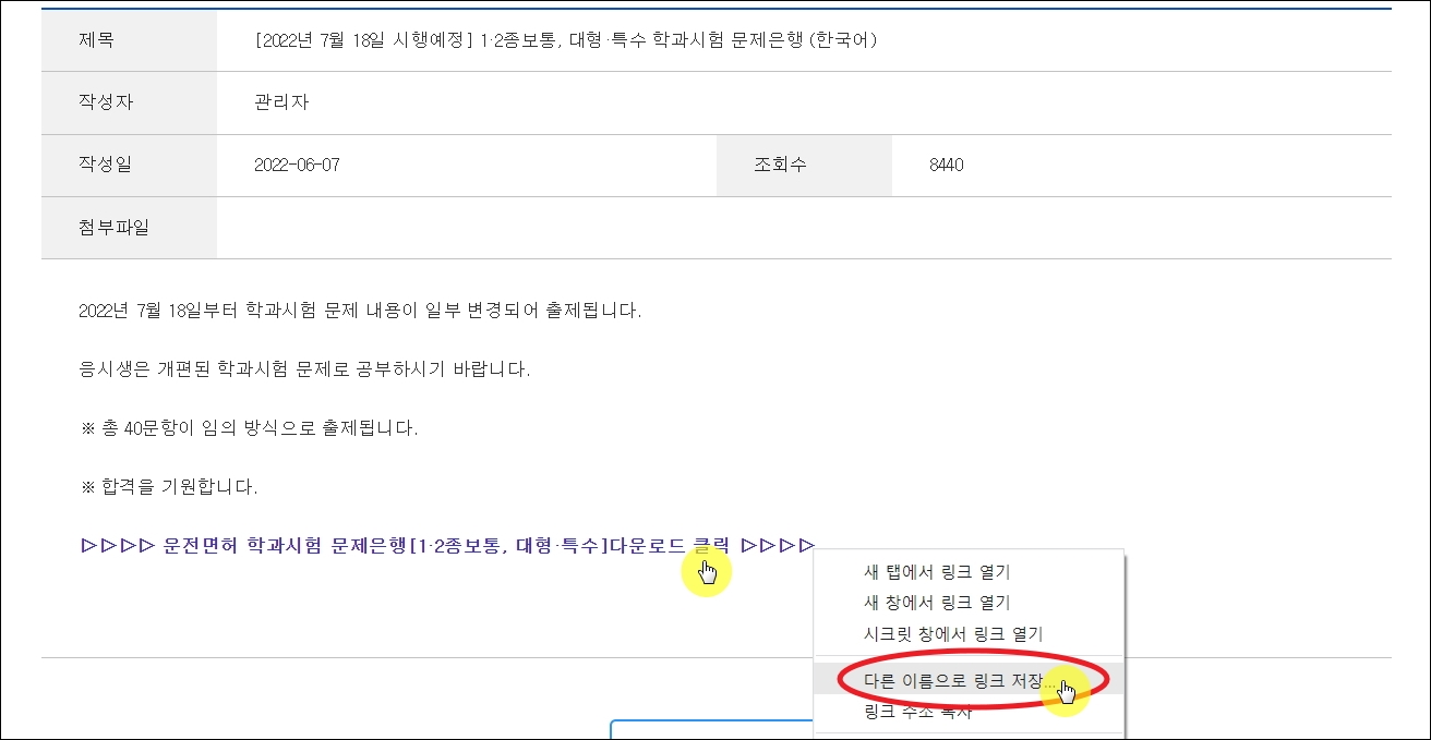 ▼이용하고 싶은 문제은행 게시물을 선택해 보았습니다. 1000개의 문항에서 총 40문항이 임의 방식으로 출제된다고, 정확하게 명시되어 있습니다. 게시글 내용에서 하단에 있는 다운로드 버튼을 클릭하면 필기시험 문제 자료를 받을 수 있습니다. 클릭했는데, 자료가 다운 받아지지 않을 수 있습니다. 이러한 경우에는 해당 버튼에 마우스 우클릭을 한 후 [다른 이름으로 링크 저장]을 선택하면 됩니다.