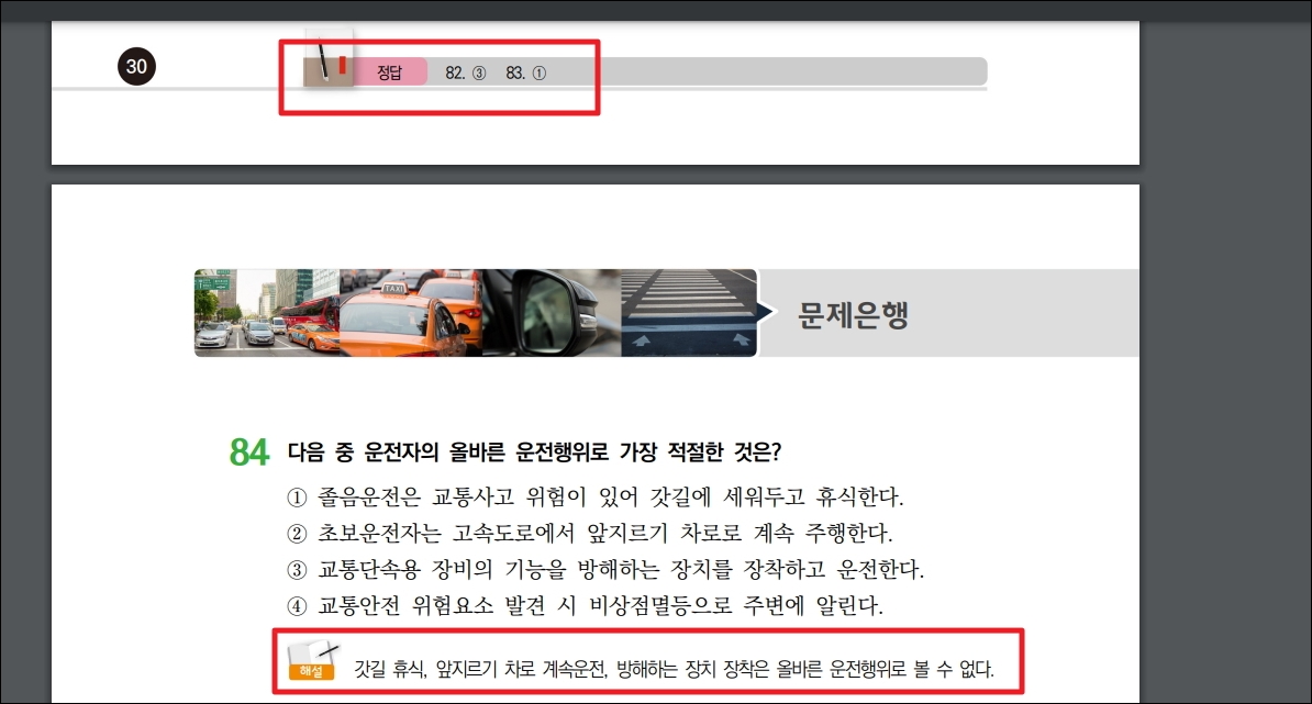 ▼방금 다운 받은 자동차 운전면허 학과시험 문제 자료를 열어보았습니다. PDF 파일로 되어 있기 때문에 PDF 뷰어 프로그램을 통해 열어볼 수 있습니다. PDF 뷰어 프로그램은 무료로 손쉽게 다운이 가능합니다. 자료를 살펴보면 문제와 함께 정답 그리고 해설이 있습니다. 해설이 있기 때문에 학습하기에 정말 좋습니다.
