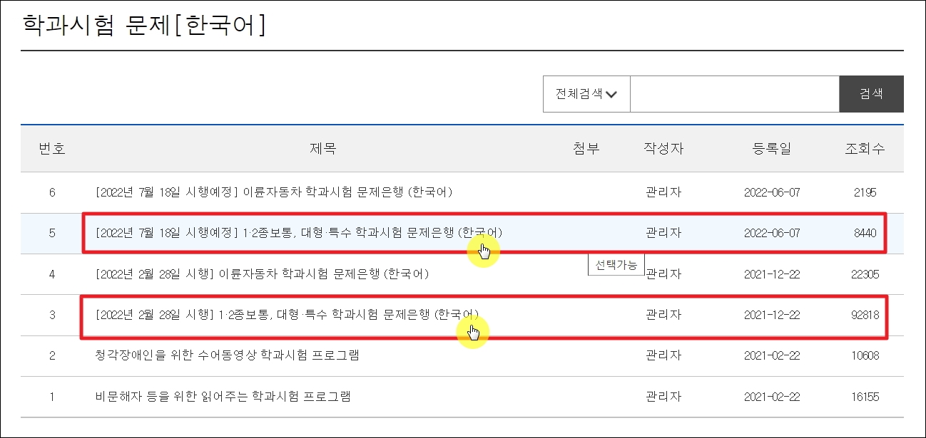 ▼새로운 페이지가 열리면서 자동차 운전면허 필기시험을 준비할 때 이용할 수 있는 자료가 여러 개 나타납니다. 게시판 형식으로 되어 있는데요. 앞서 제가 언급한 바와 같이 2022년 7월 18일 기준으로 운전면허 필기시험에서 몇 가지 변경된 사항이 있습니다. 이를 반영하여 새로운 필기시험 문제은행 자료가 올라와 있네요. 이륜자동차 필기시험을 준비하는 사람들에게 필요한 자료도 올라와 있습니다.