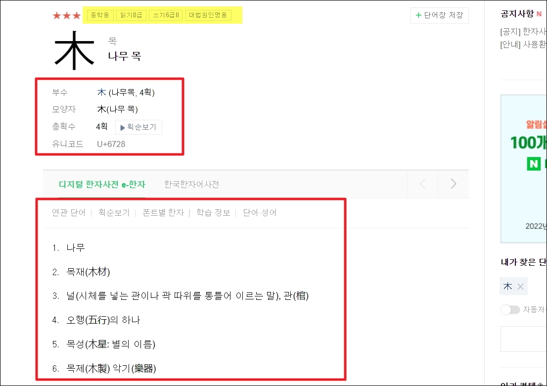 ▼저는 "나무 목"이라는 한자를 선택했습니다. 부수, 총획수, 유니코드, 모양자, 난이도와 같은 정보와 함께 굉장히 많은 뜻이 나타났습니다.