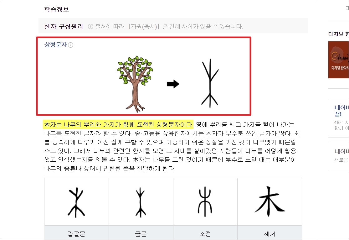 ▼한자의 구성원리를 이해하면 한문을 좀 더 재미있고, 효과적으로 공부할 수 있습니다. "나무 목"의 경우에는 나무의 뿌리와 가지가 함께 표현된 상형문자라고 합니다. 다음과 같은 그림을 기억하고 있으면 쉽게 까먹지 않을 거에요.