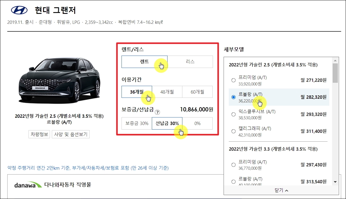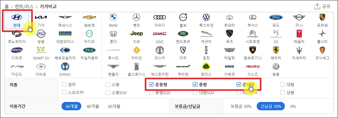 ▼가격 비교를 하고 싶은 차량을 선택할 차례입니다. 브랜드와 차종, 이용기간, 보증금 및 선납금 조건을 지정해 주세요. 아무래도 국내에서는 현대자동차가 많습니다. 그만큼 합리적인 가격으로 이용하는 데에 유리할 수 있습니다. 차종은 준중형, 중형, 중대형을 체크했습니다.