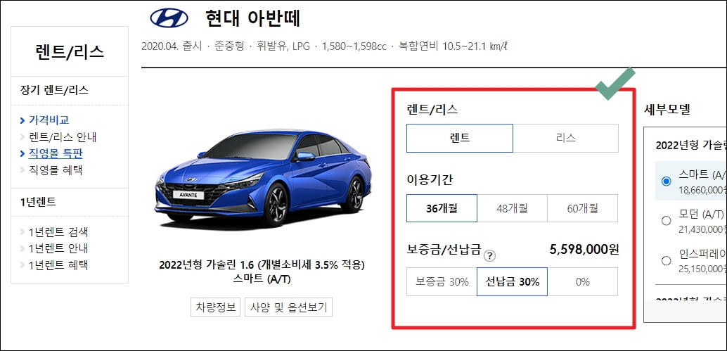 ▼차량 리스트에서 렌트 가격을 클릭해 보세요. 그럼 다음과 같이 선택한 차량에 대한 상세 조건을 변경할 수 있는 페이지가 나타납니다. 이용기간을 늘리거나 보증금 및 선납금 조건을 변경할 수 있습니다. 세부모델의 경우에는 높은 등급을 선택할수록 가격이 올라감을 알 수 있습니다.