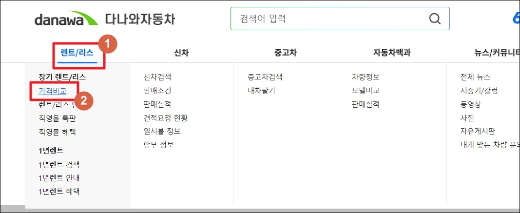 ▼다나와 자동차 홈페이지에 접속하면 메뉴를 열어보세요. 메뉴에서 [장기 렌트 / 리스] 또는 [가격 비교]를 클릭합니다. 참고로 이곳에서는 신차, 중고차, 리스 차량에 대한 정보 얻거나 가격 비교를 할 수 있게 되어 있습니다.