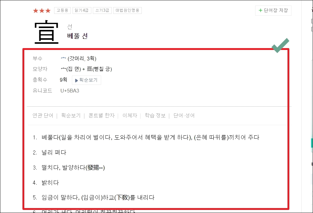 ▼관련 있는 한자, 단어, 고사성어가 추가로 나타납니다. 여기에서 상세한 사전 정보를 알고 싶은 것을 클릭해 보세요. 저는 "베풀 선"자를 클릭해보겠습니다.