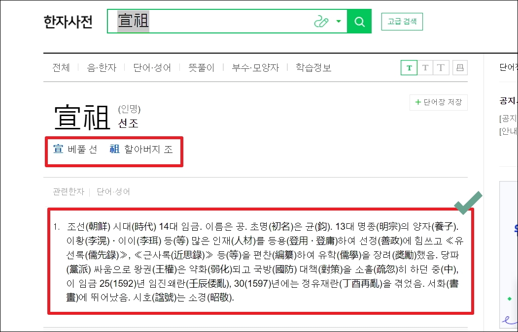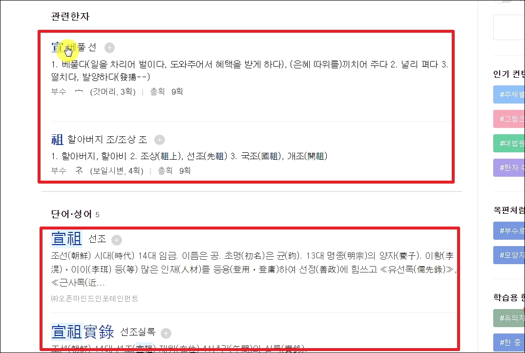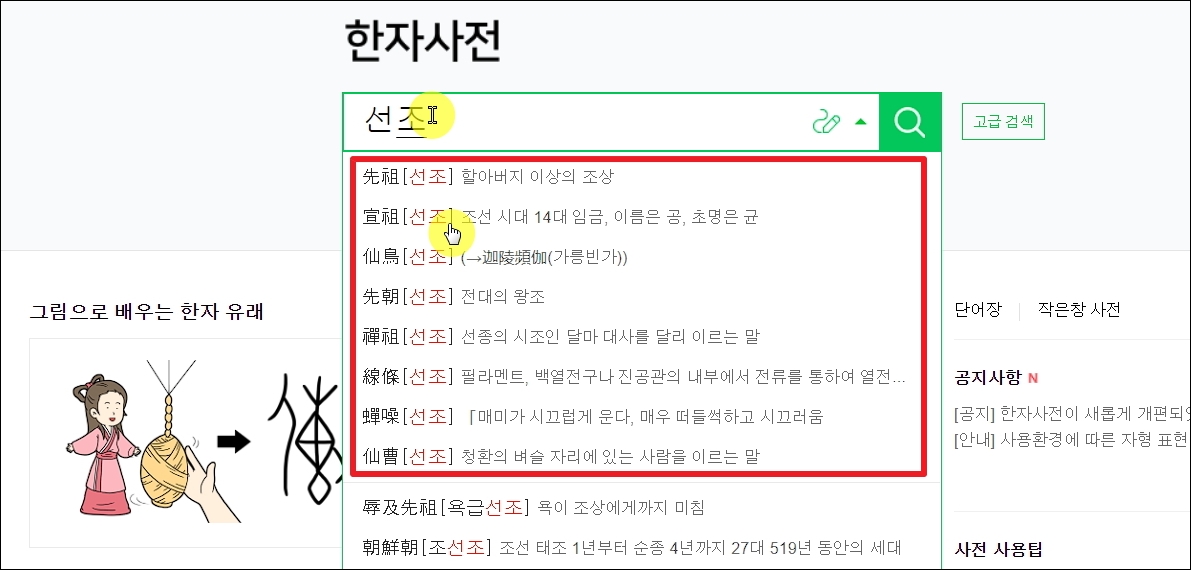▼저는 "선조"라는 단어를 검색해 보았습니다. 해당 단어를 구성하는 각 한자의 뜻은 물론이고, 해당 단어에 대한 상세한 설명이 나타납니다.
