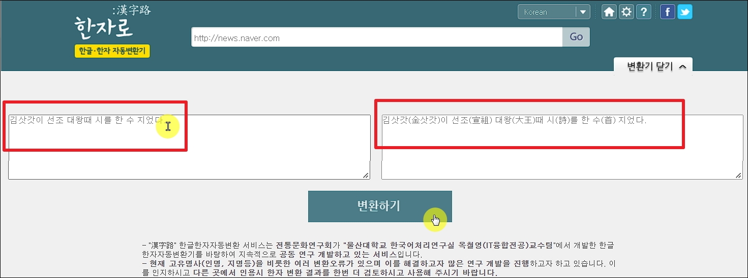 ▼첫 번째 방법을 사용하기 위해서는 전통문화연구회에서 제작한 자동변환기를 사용하면 됩니다. 전통문화연구회의 "한자로" 사이트에 접속하면 해당 프로그램을 만나볼 수 있습니다.