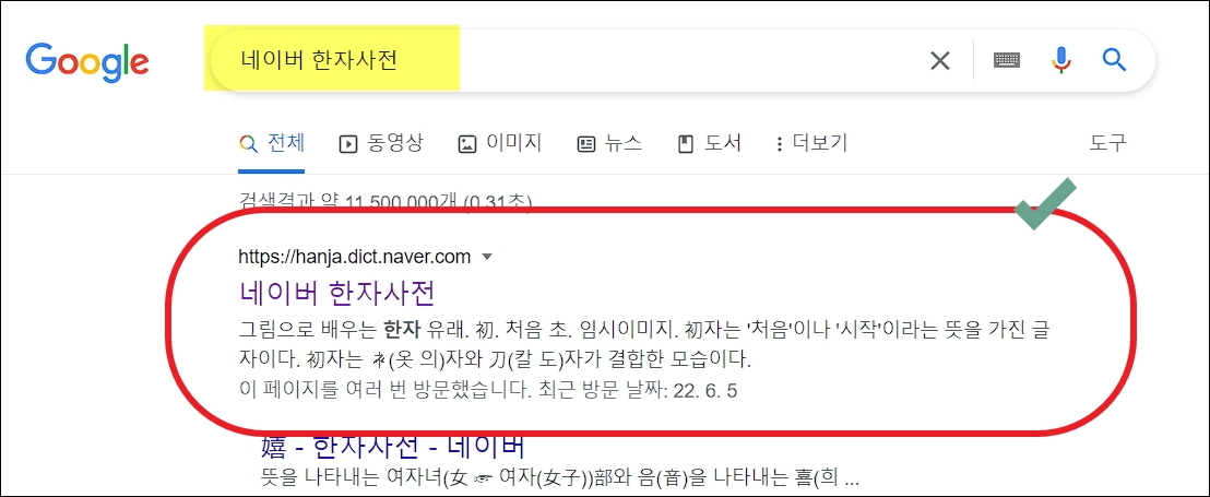 ▼이번에는 한글로 한자찾기 두 번째 방법을 알려 드리겠습니다. 이 방법을 사용하면 좀 더 정확한 결과를 얻을 수 있습니다. 사전 사이트를 이용하려고 하는데요. 검색을 통해 접속해주세요.