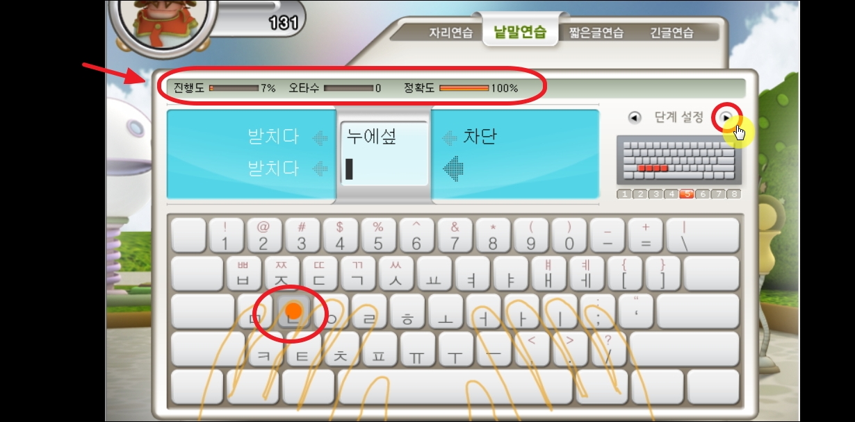 ▼자리를 익히고 나면 낱말 가지고 연습해야 합니다. 진행도, 오타수, 정확도와 같은 지표를 실시간으로 확인하면서 타자연습 진행을 할 수 있습니다.