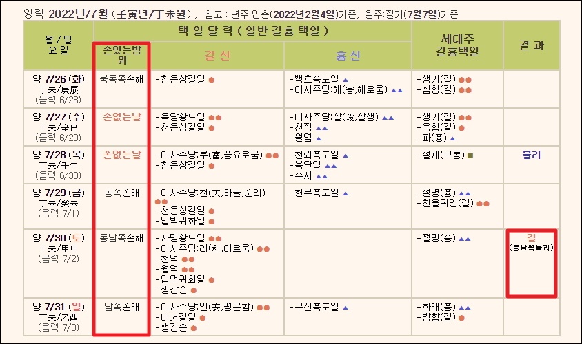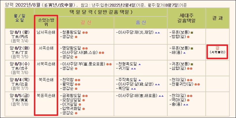 ▼사주처럼 이사를 가는 방향이 사람마다 가져다 주는 기운이 다릅니다. 다음은 제 기준인데요. 2022년 8월 1일부터 8월 5일까지 피해야 하는 방위가 정리되어 있습니다. 여기에 더하여 택일을 하는 데에도 도움이 되는 정보를 포함하고 있는데요. 이것은 풀이의 일부에 해당하고, 전체 풀이를 보는 법을 알려드리겠습니다.