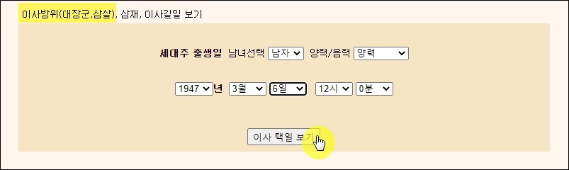 ▼길흉을 가져다주는 이사방향을 보는 일을 하기에 앞서 몇 가지 정보를 입력해야 합니다. 세대주 출생일에 대한 정보인데요. 태어난 시각까지 모두 입력한 후 [이사 택일 보기] 버튼을 클릭해 주세요.