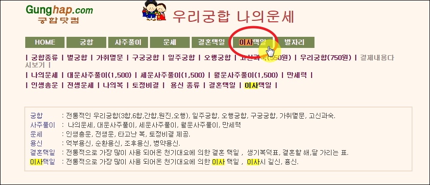 ▼우리궁합 나의운세 사이트에 접속했습니다. 이사방향에 대한 내용을 보기 위해서는 메뉴에 있는 [이사택일]을 클릭해야 합니다. 해당 서비스를 통해 이사 관련 날짜와 방향에 대해 알아볼 수 있습니다.