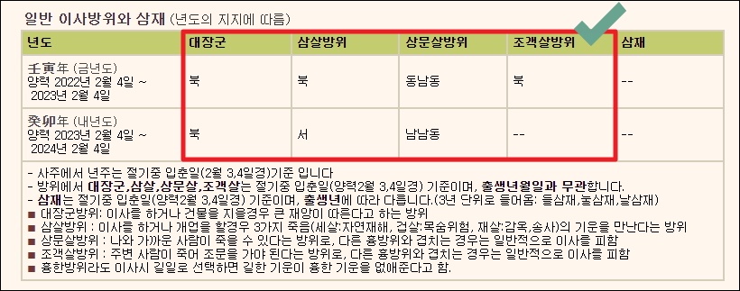 ▼새로운 페이지가 열리면서 다양한 풀이가 나타납니다. 보는법은 해석마다 하단에 기재가 되어 있습니다. 가장 먼저 일반 이사방위와 삼재에 대한 내용인데요. 22년과 23년에 피해야 하는 방향을 확인할 수 있습니다.