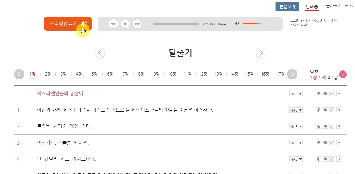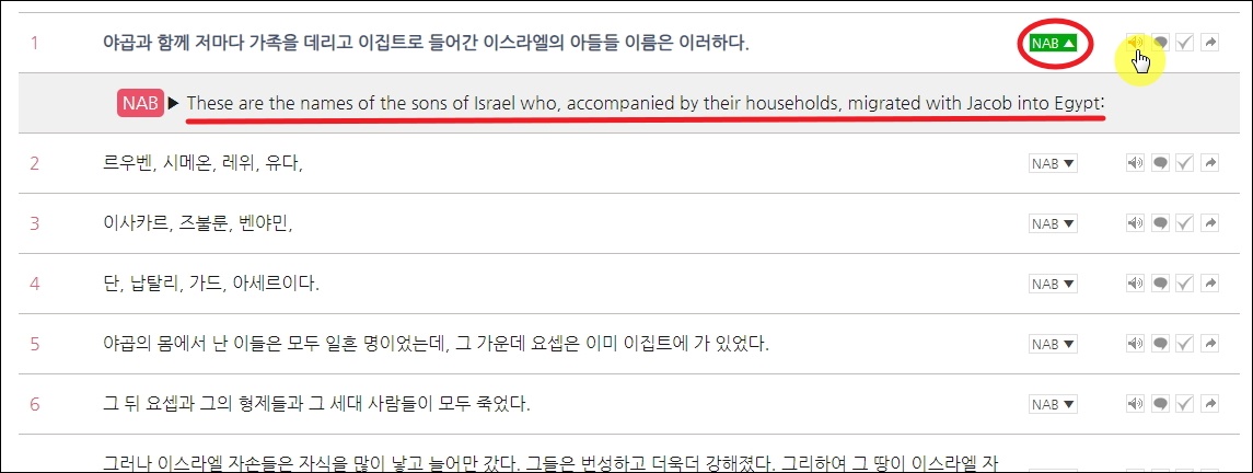 ▼문장마다 오른쪽에 여러 버튼이 있는데요. NAB 버튼을 클릭하면 한글 구절에 대한 영어 문장을 확인할 수 있습니다. 한글로 읽기 어려울 때 사용하면 좋은 기능입니다. 그 옆에 있는 스피커 모양의 아이콘을 클릭해 보세요. 그럼 해당 성경 구절을 음성으로 들을 수 있습니다.