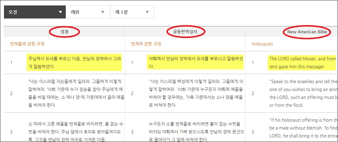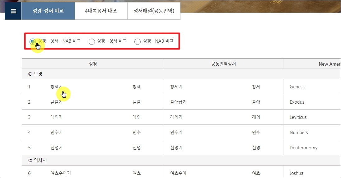 ▼이번에는 성경 비교 메뉴를 선택해 보았습니다. 성경, 성서, NAB의 같은 구절을 비교해볼 수 있는 기능인데요. 읽고 싶은 부분을 선택해 주세요.