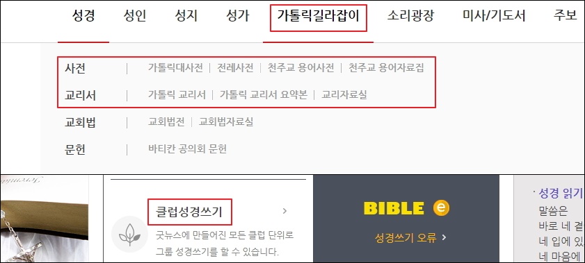 ▼앞서 언급한 바와 같이 제가 이용하는 성경읽기 사이트를 이용하면 다음과 같은 가톨릭 길라잡이 서비스를 이용할 수 있습니다. 사전이나 교리서 등의 자료를 이용할 수 있죠. 좀 더 깊이 있게 읽고 싶은 분들을 위한 성경쓰기 서비스도 제공하고 있습니다.