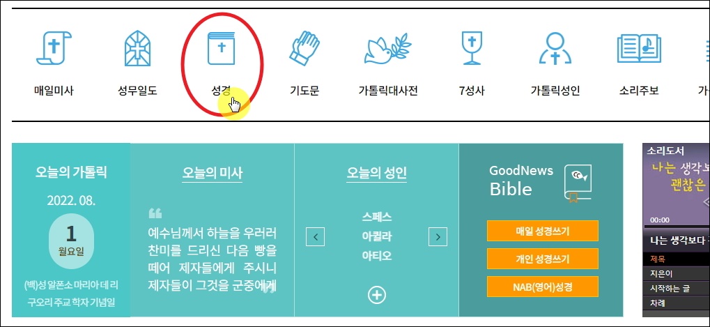 ▼사이트에 접속하면 가장 먼저 눈에 띄는 것은 오늘의 기념일, 미사, 성인에 대한 것입니다. 천주교를 믿으신다면 사이트 방문을 할 때마다 한 번씩 보면 좋은 내용들이죠. 메인화면 중앙에는 여러 가지 서비스 메뉴가 나타나는데요. 여기에서 세 번째에 위치한 [성경]을 클릭해 주세요.