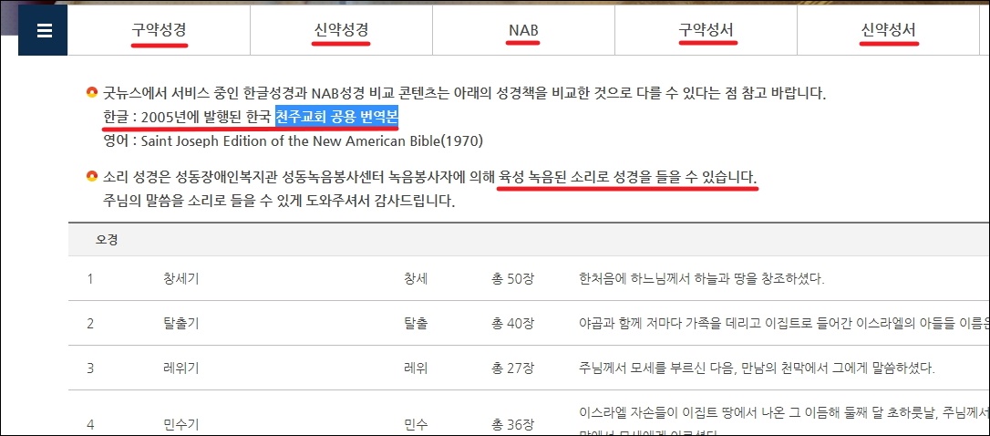 ▼이곳에서 읽기 가능한 가톨릭 성경의 종류는 다양합니다. 구약 및 신약성경, 영어로 된 NAB, 구약성서, 신약성서가 있죠. 읽고 싶은 콘텐츠를 선택하면 화면에 여러 쳅터가 순서대로 나타납니다. 여기에서 읽고 싶은 쳅터를 클릭해 주세요.