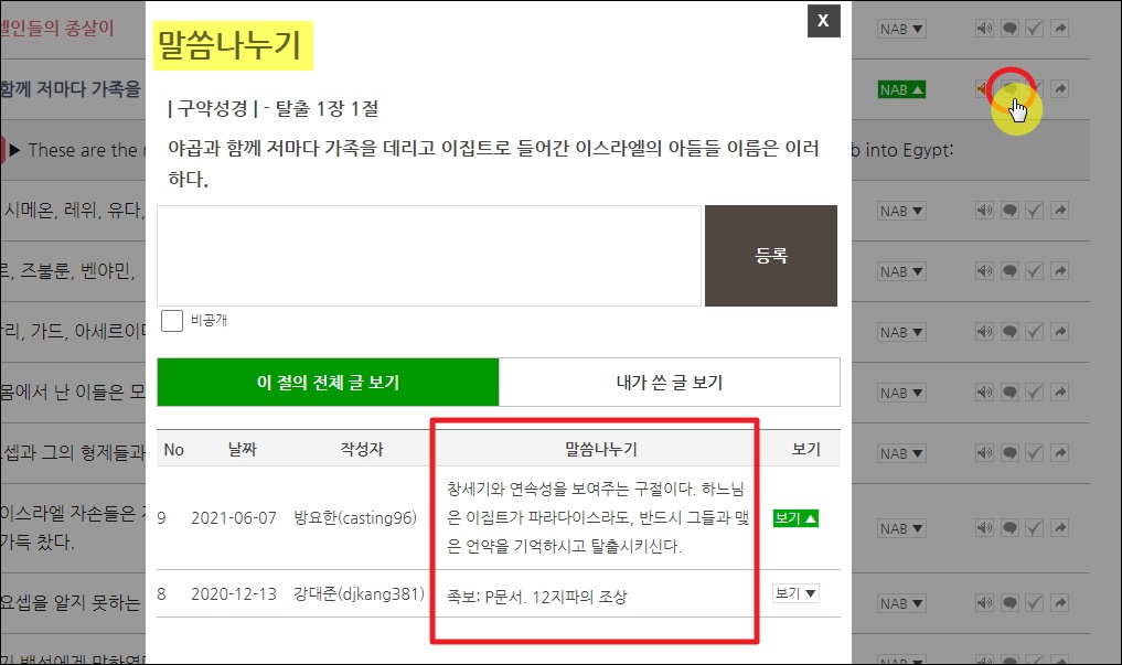 ▼음성 버튼 옆에는 말풍선 모양의 아이콘이 있는데요. 말씀 나누기 기능을 사용하는 버튼입니다. 해당 버튼을 누르면 읽고 있는 구절에 대하여 여러 사람이 이야기를 나눌 수 있어요. 굿뉴스 가톨릭 사이트에 로그인을 해야 말씀 등록이 가능합니다. 참고로 가톨릭 성경쓰기를 할 때에도 로그인이 필요합니다.