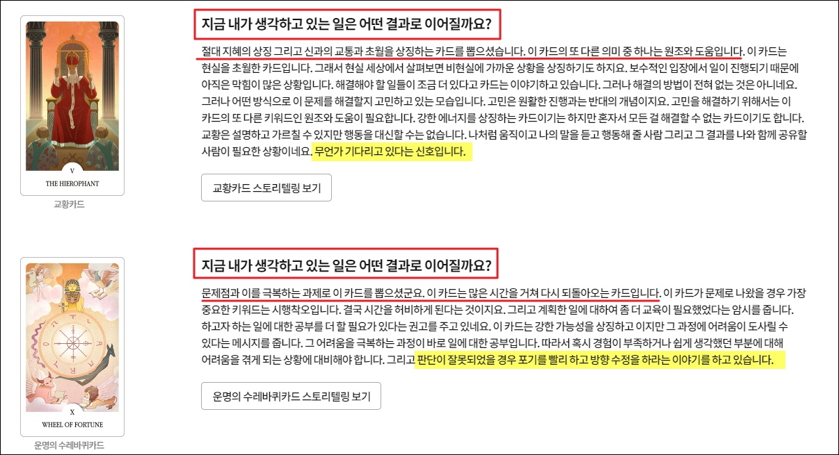 ▼해당 운세 서비스를 통해 지금 내가 생각하고 있는 일이 어떤 결과로 이어질지 확인할 수 있는데요. 어떤 카드를 선택하느냐에 따라 해석이 달라집니다.