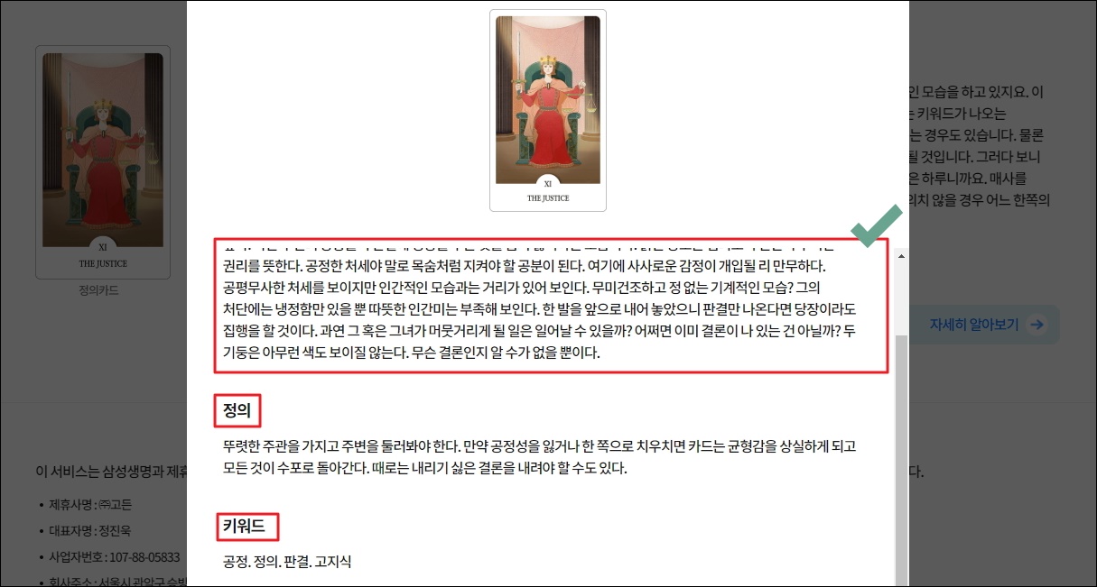▼정의카드에 대한 스토리텔링이 나타났습니다. 이를 통해 해당 타로 카드에 대한 상세한 의미, 정의, 관련 키워드를 확인할 수 있는데요. 타로카드에 대한 공부를 하는 분이라면 관심을 가지고 이용해 보면 좋을 것 같습니다.