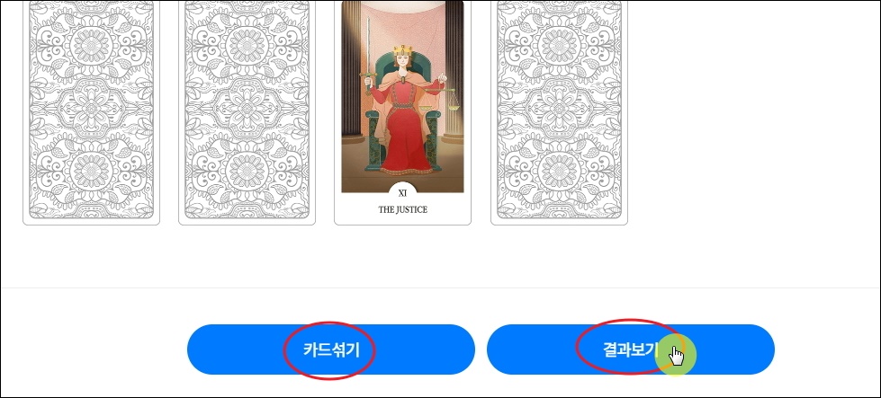 ▼카드를 선택할 때에 집중이 되지 않았거나 실수로 마우스 버튼을 잘못 누를 때가 있습니다. 이런 경우에는 [카드 섞기] 버튼을 눌러서 오늘의 타로 서비스를 초기화하면 됩니다. 제대로 카드를 뽑았으면 [결과보기] 버튼을 누르면 되고요.